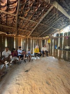 Chegada na comunidade, apresentação e conversa com os professores na Sala Anexa da Aldeia da Curva. Atividades sobre os clãs com a Professora Roberta.